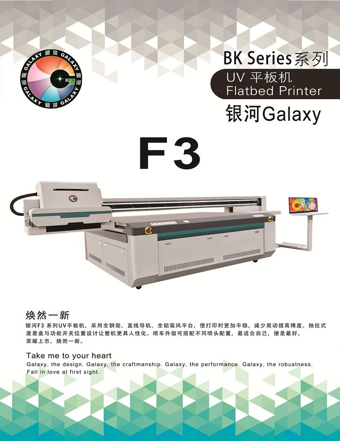 銀河F3系列UV平板機(jī),采用全鋼架、直線導(dǎo)軌、全鋁吸風(fēng)平臺(tái),使打印時(shí)更加平穩(wěn),減少晃動(dòng)提高精度。抽拉式廢墨盒與功能開關(guān)位置設(shè)計(jì)讓整機(jī)更具人性化。噴車升級(jí)可搭配不同噴頭配置,最適合自己,便是最好。 榮耀上市,煥然一新。
