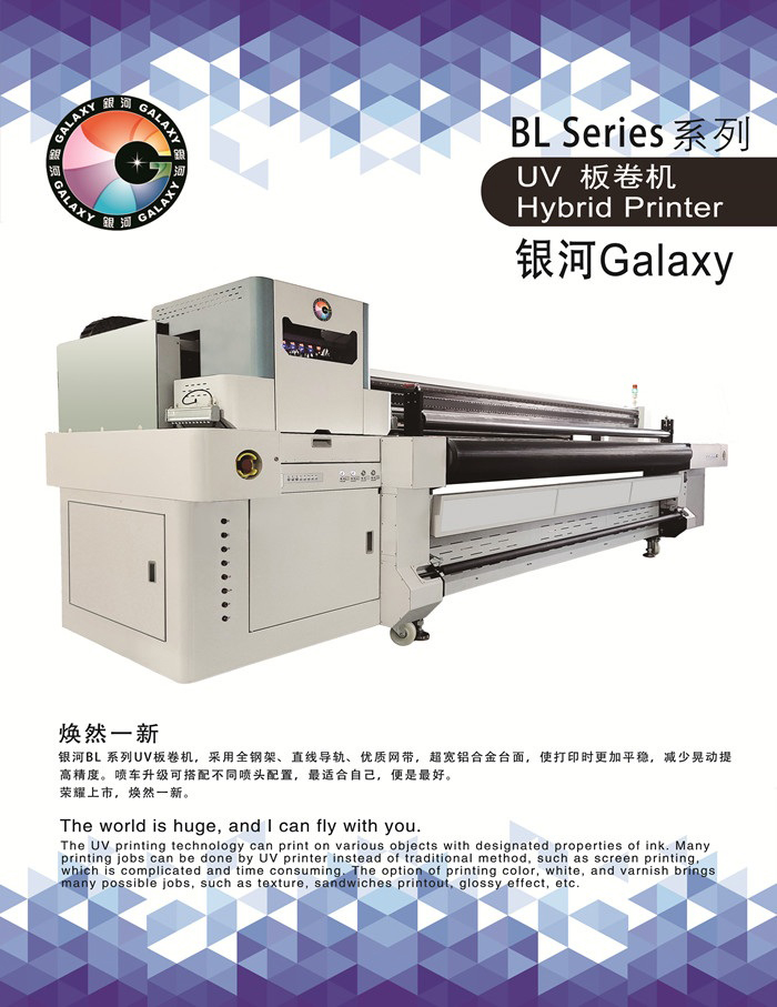 銀河BL系列UV板卷機(jī),采用全鋼架、直線導(dǎo)軌、優(yōu)質(zhì)網(wǎng)帶,超寬鋁合金臺(tái)面,使打印時(shí)更加平穩(wěn),減少晃動(dòng)提 高精度。噴車升級(jí)可搭配不同噴頭配置,最適合自己,便是最好。 榮耀上市,煥然一新。